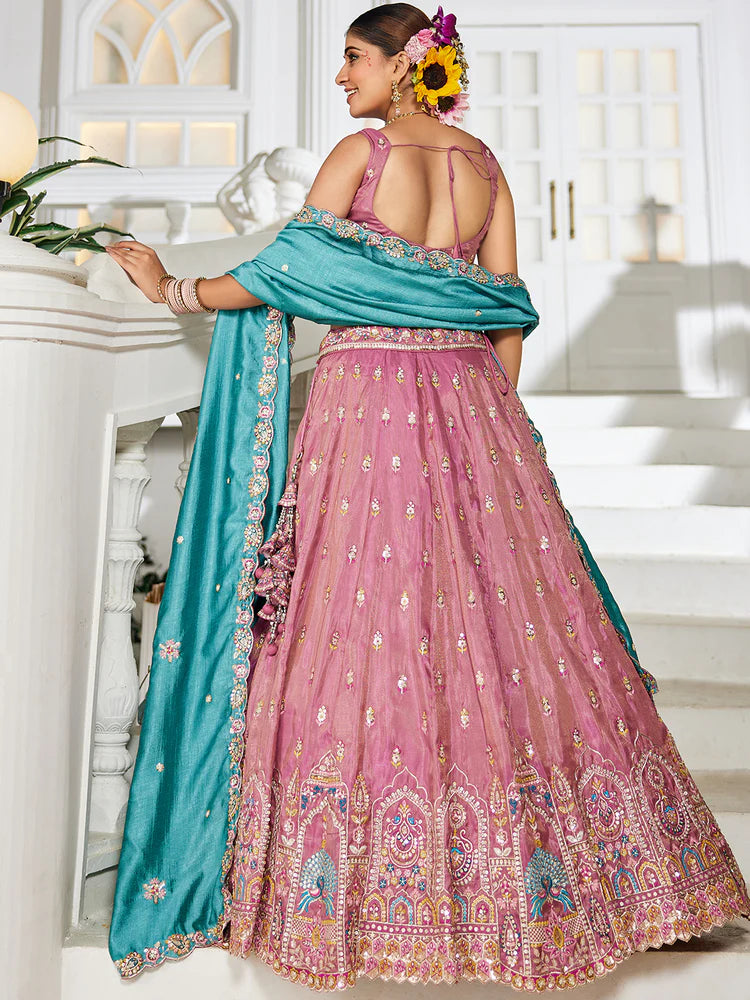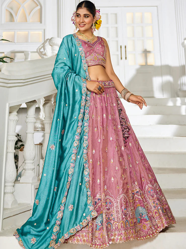 Pink Premium Tissue Sequin Embroidered Lehenga Choli Set with Ethnic Cutwork Dupatta & Handmade Tassels