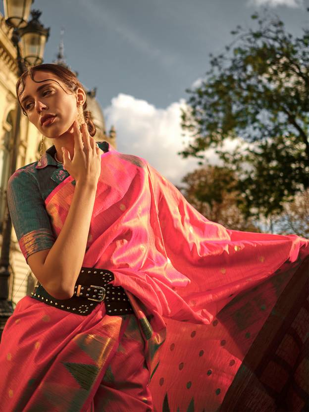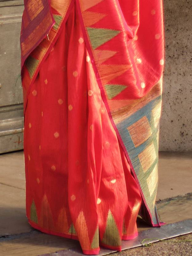 Crafted from a luxurious silk blend fabric, this saree features a rich woven pattern and comes in a classic red hue, perfect for party and festive occasions.