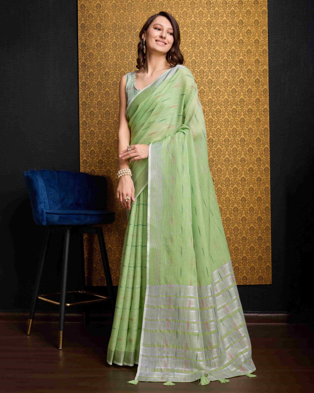 Drape yourself in elegance with this exquisite Pista and gold-toned ikat saree, featuring a beautifully woven design and a shimmering zari border. Crafted from a premium linen blend, this saree offers both comfort and sophistication, making it a perfect choice for festive occasions, weddings, and celebrations.