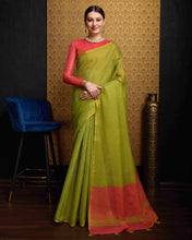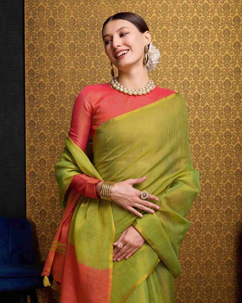Pista Elegant Woven Design Linen Blend Saree with Zari Border