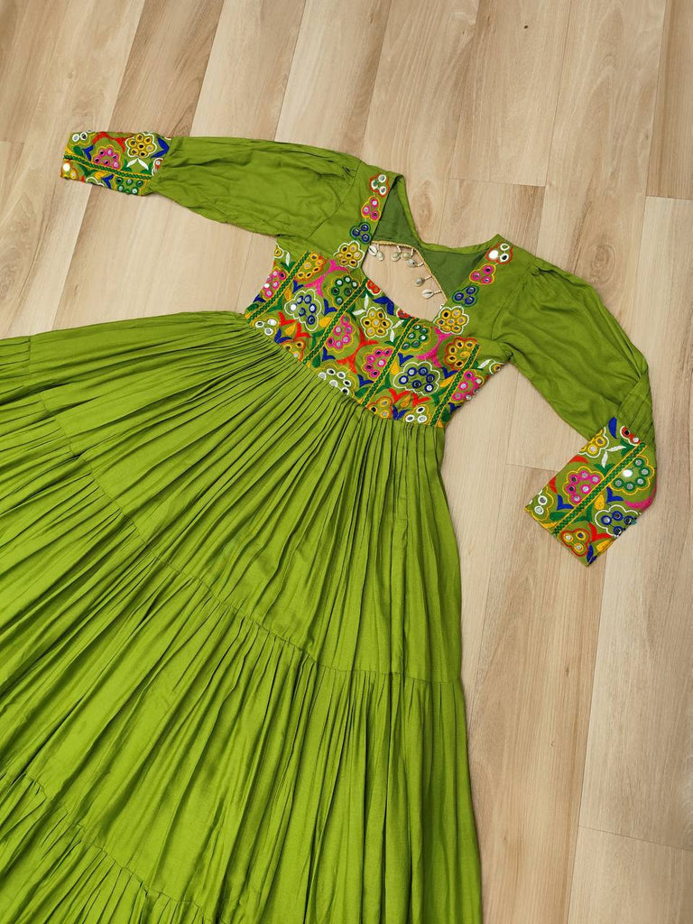 Pista Rayon Kutchi Gamthi Work Gown with 3-Layer Frill & 12 Meter Flair