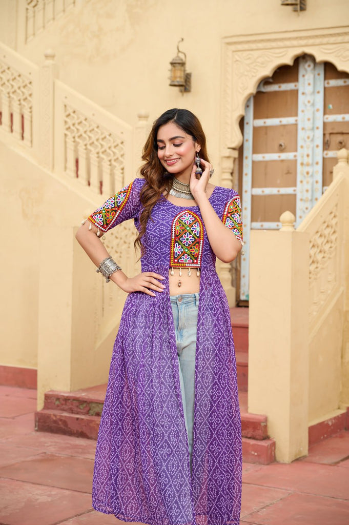Purple Bandhani Print Faux Georgette Kurti with Kutchi Patchwork