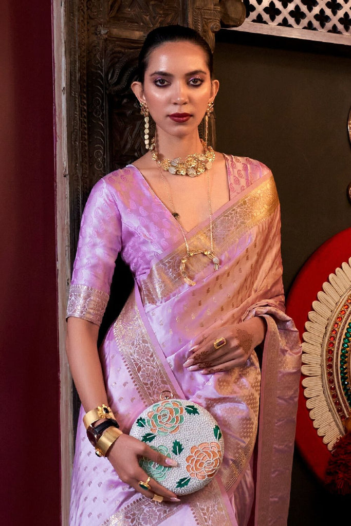 Purple Elegant Pure Satin Handloom Saree with Unstitched Blouse Piece
