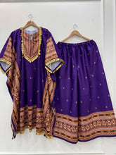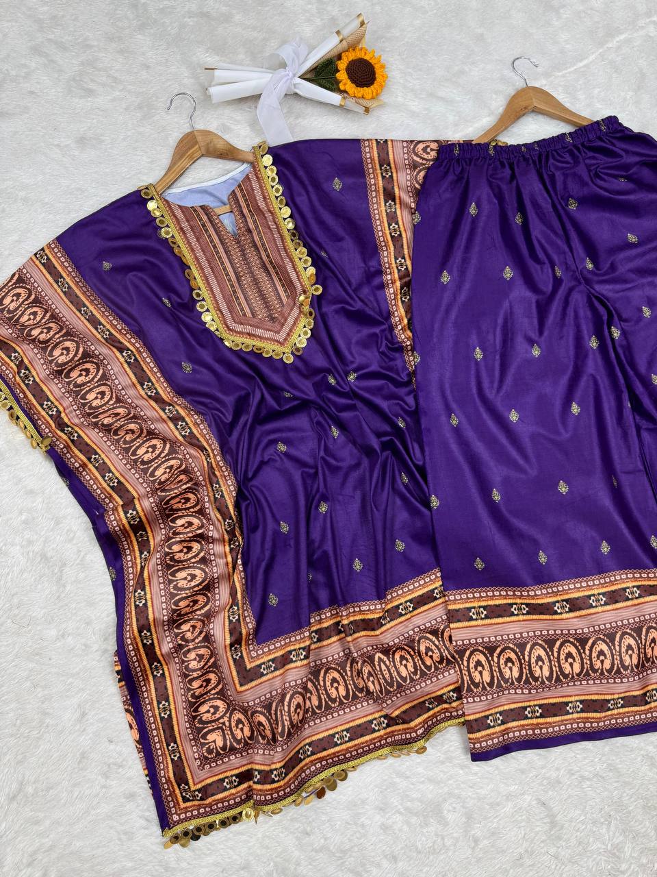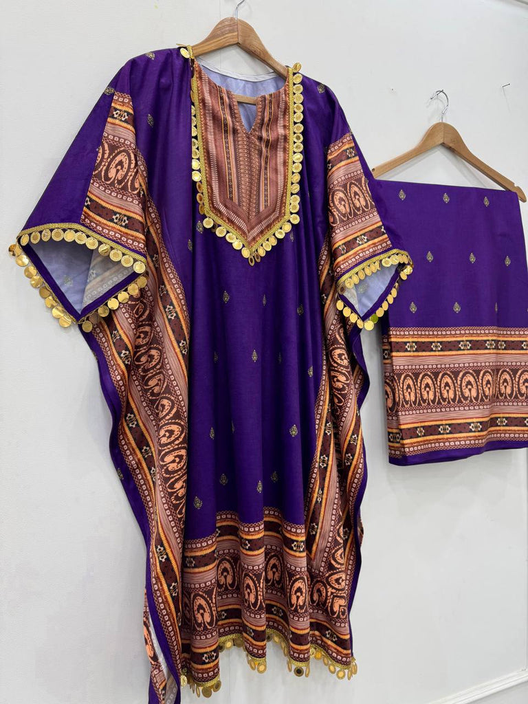 Purple Elegant Viscose Velvet Kaftan with Plazo – Digital Print & Lace Border