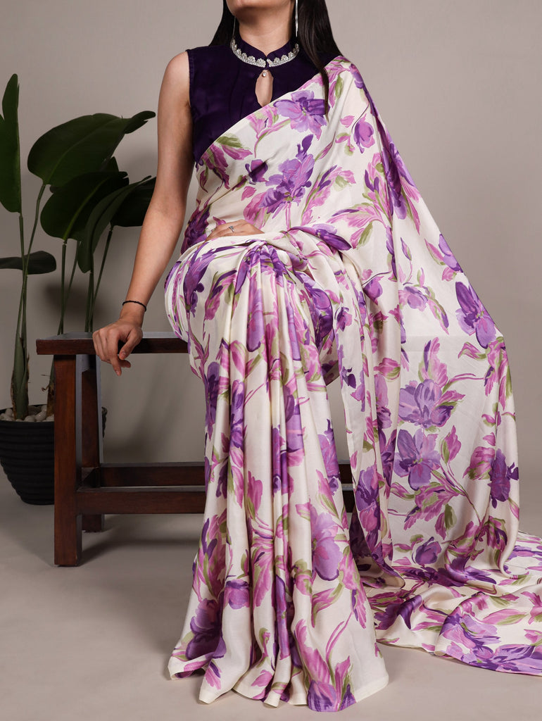 Purple Floral Printed Satin Silk Saree with Fully Stitched Adjustable Natural Silk Blouse & Lace Detailing – Party & Festive Wear ClothsVilla