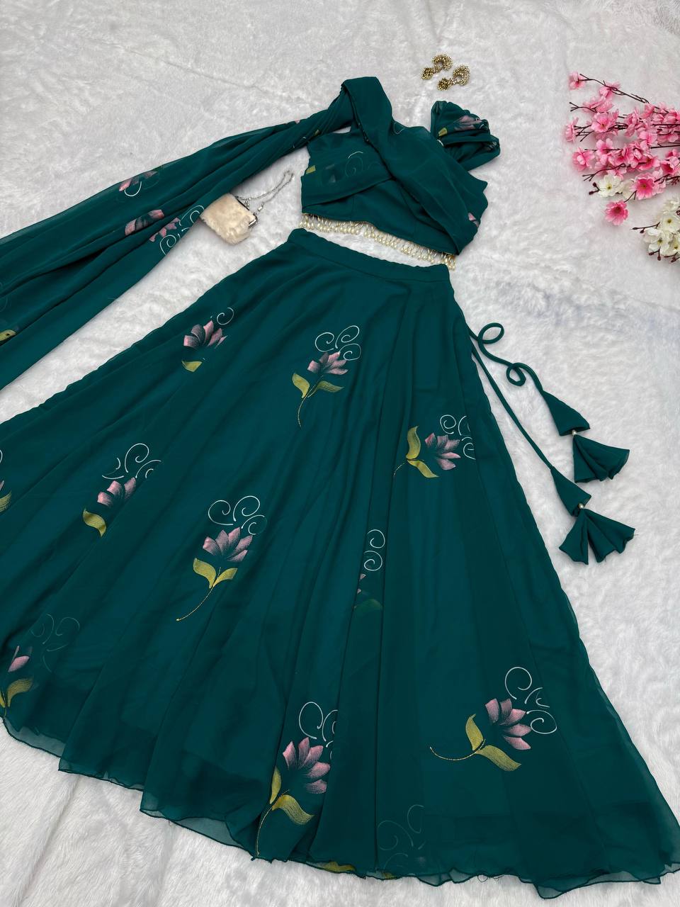Lehenga: A mesmerizing 8-meter flair georgette lehenga adorned with vibrant floral prints, finished with a structured canvas patta for volume and a comfortable adjustable waist dori.