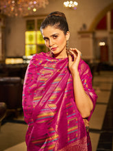 Rani Pink Kanjeevaram saree, featuring intricate woven designs and a luxurious zari-detailed border. Crafted from delicate organza fabric, this saree embodies a perfect blend of traditional craftsmanship and contemporary grace, making it an ideal choice for weddings, festive celebrations, and special occasions.