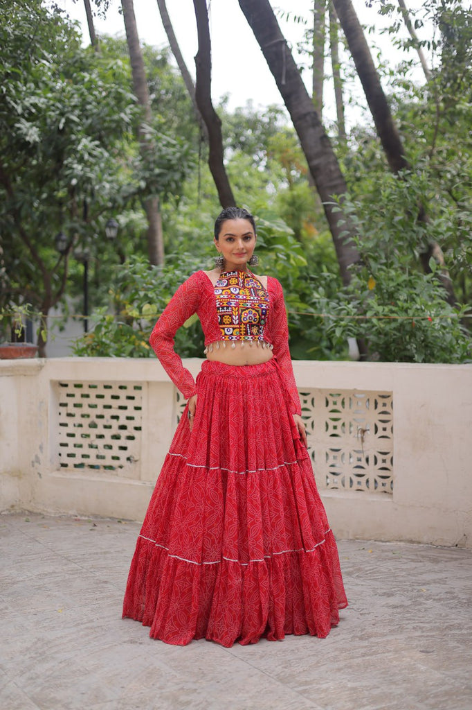 Red Bandhej Print Faux Georgette Lehenga Choli Set with Gotta Patti & Gamthi Embroidery – Stitched