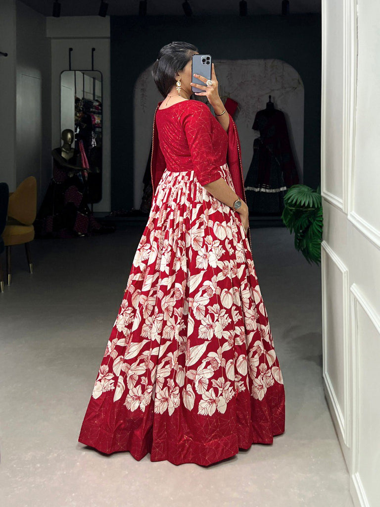 Red Elegant Tussar Silk Ready-to-Wear Gown with Dupatta