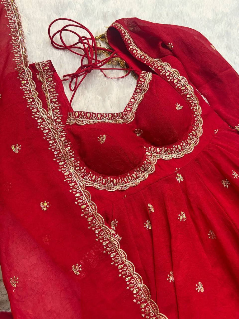 Red Faux Georgette Thread & Sequin Embroidered Anarkali Set with Pant and Dupatta