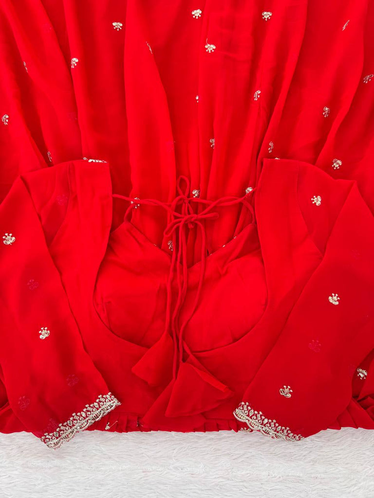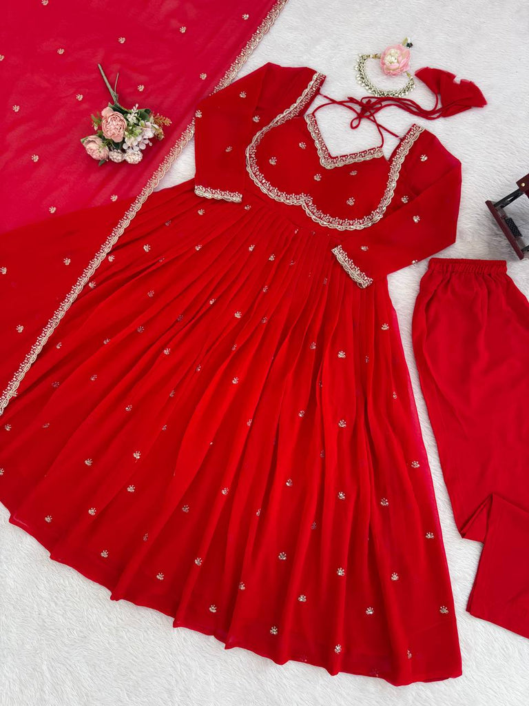 3-piece Anarkali Set, exquisitely crafted from premium Faux Georgette and detailed with delicate thread embroidery and shimmering sequins. Perfect for festive occasions, weddings, and parties, this set combines traditional artistry with modern comfort.
