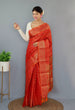 Introducing the stunning Red Saree in Rajkoti Patola Silk, a true masterpiece of traditional Indian craftsmanship. This saree is adorned with intricate gold zari meenakari weaves all over the body, creating a mesmerizing effect that is sure to turn heads. The saree is further enhanced with a gold zari decent woven border, adding a touch of elegance to the overall design. The saree is crafted with an exquisite Zari Woven Pallu, which adds a regal touch to the overall look. The saree measures 5.5m in length, while the blouse length is 0.8m, making it perfect for any occasion, be it a party, wedding or casual event. Get ready to make a statement with this beautiful Red Saree in Rajkoti Patola Silk.
