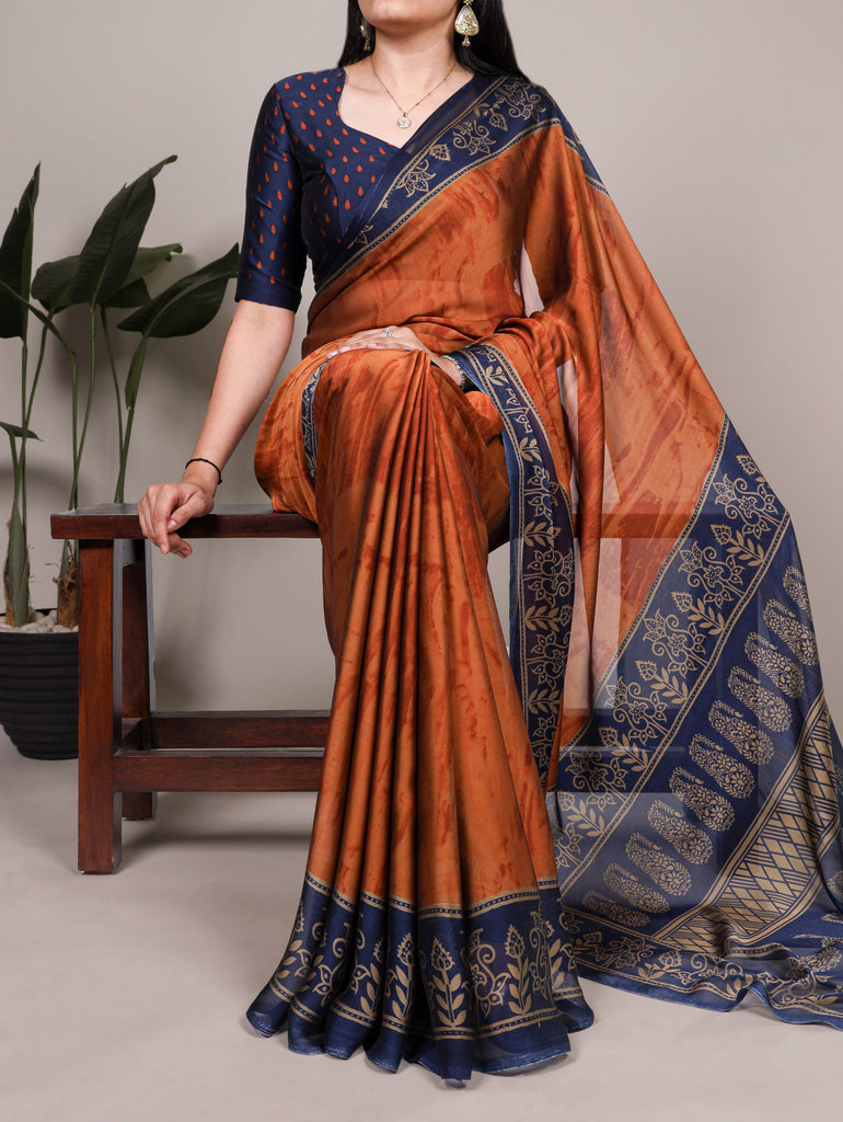 Rust Orange Elegant Rangoli Silk Printed Saree with Matching Unstitched Blouse – Lightweight Daily, Festive & Casual Wear