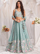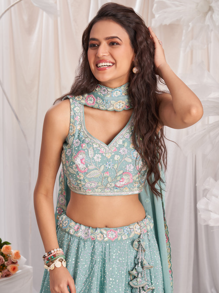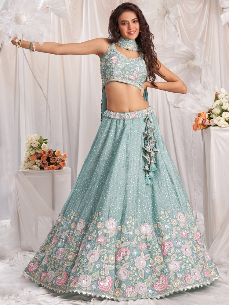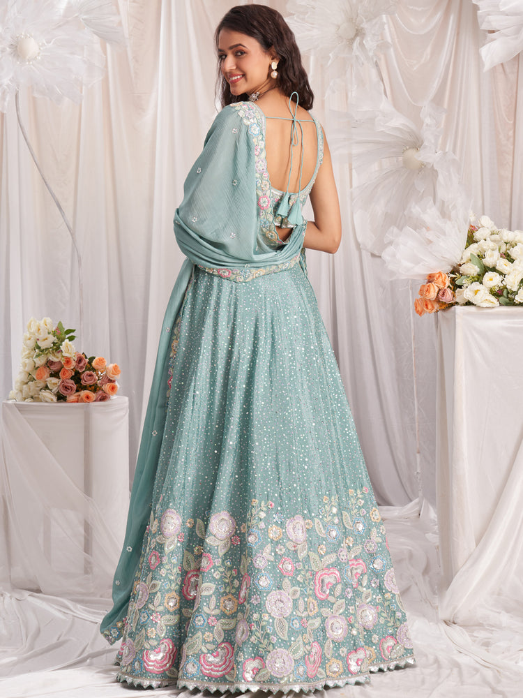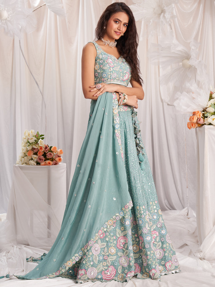 Sea Green Pure Chiffon Sequins and thread embroidery Semi-Stitched Lehenga choli & Dupatta