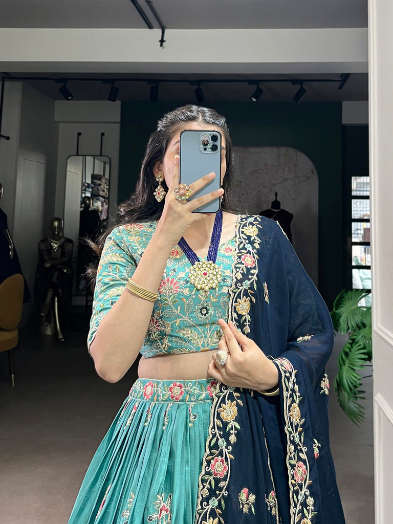 Sky Blue Designer Slab Silk Embroidered Lehenga Choli Set with Chiffon Dupatta