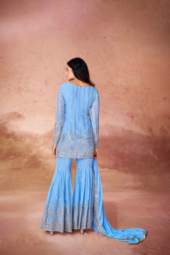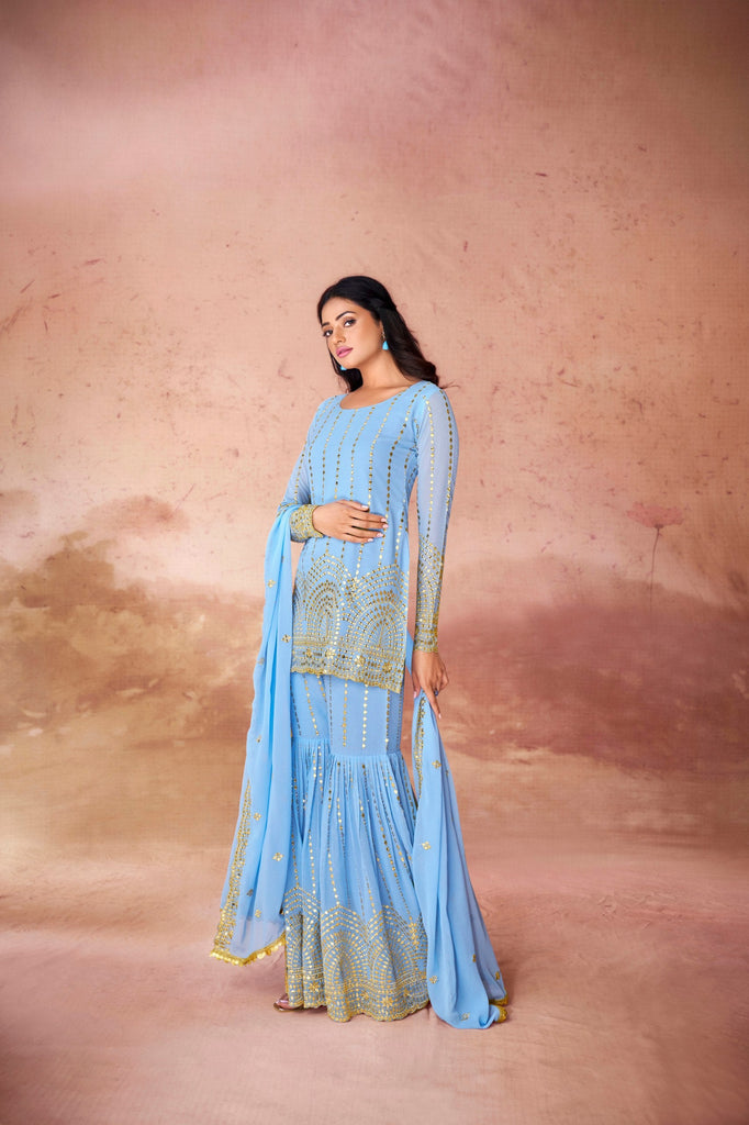 Sky Blue Embroidered Georgette Sharara Set with Sequin Work & Dupatta – Ready to Wear
