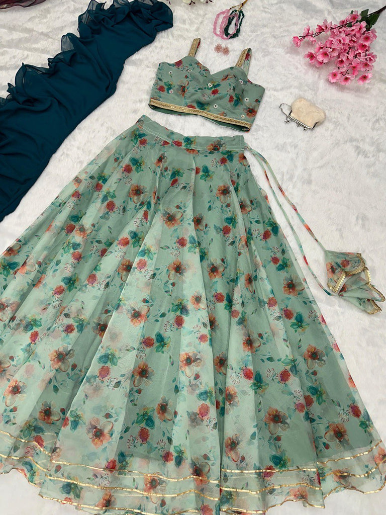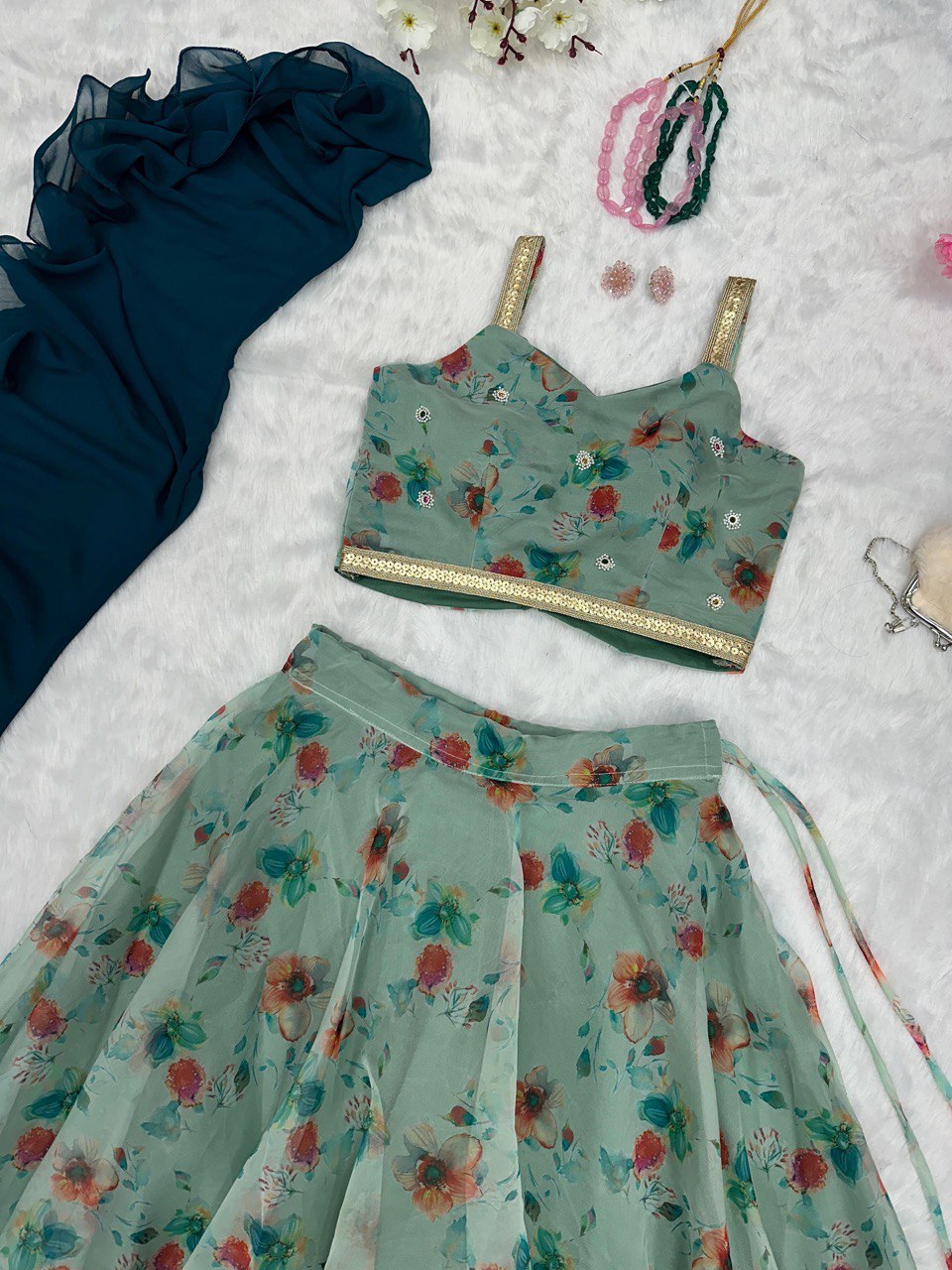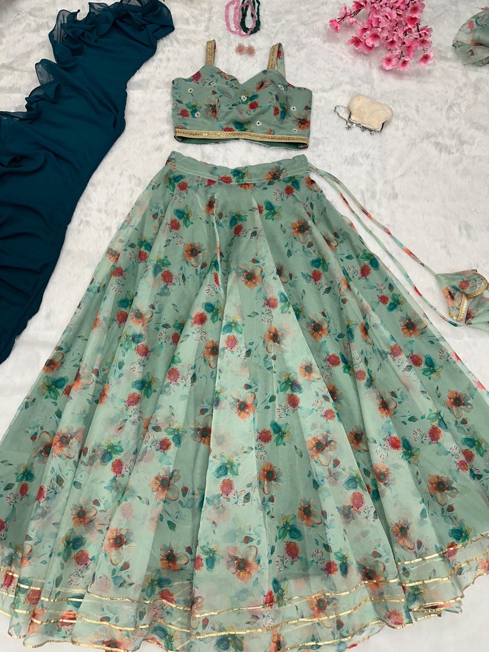 With its exquisite craftsmanship and modern design, this lehenga is fully stitched and ready to wear, making it a hassle-free choice for those who appreciate intricate details. Elevate your wardrobe with this exclusive organza lehenga and be the epitome of elegance at any event