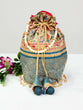 Immerse yourself in cultural elegance with this captivating Batwa, a traditional Indian pouch crafted from luxurious Dola silk. This exquisite piece boasts a captivating foil print, adding a touch of glamour and sophistication. The artistry is further enhanced by delicate stone embellishments, meticulously hand-stitched to create a mesmerizing pattern.