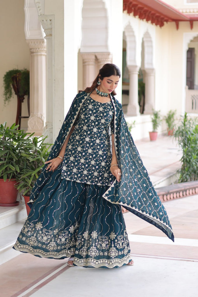 Teal Elegant Faux Georgette Sequins Embroidered Kurti with Sharara & Dupatta Set – Premium Party & Festive Wear
