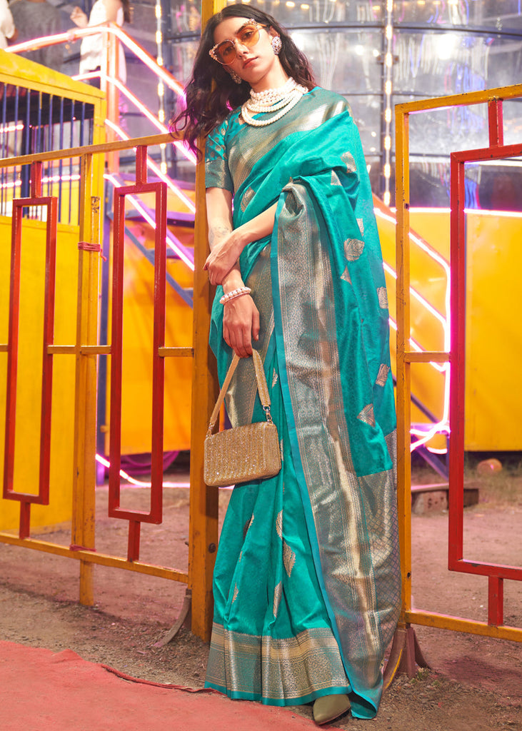 Teal Floral Printed Banarasi Silk Saree with Zari Woven Pallu