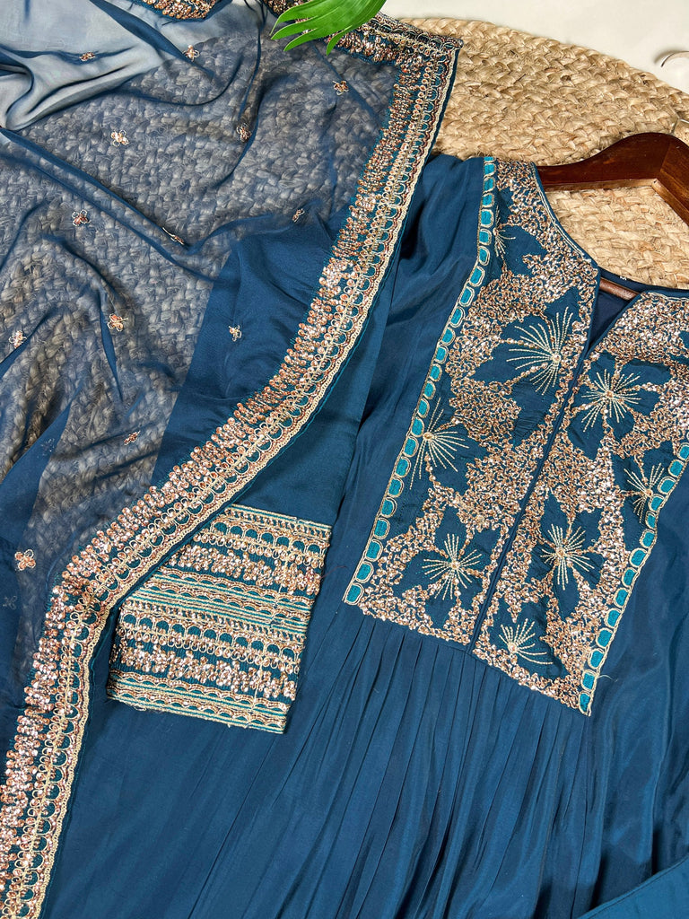 Teal Roman Silk Sequins & Thread Embroidered Kurti Pant Set with Organza Embroidered Dupatta – Stitched Premium Ensemble ClothsVilla