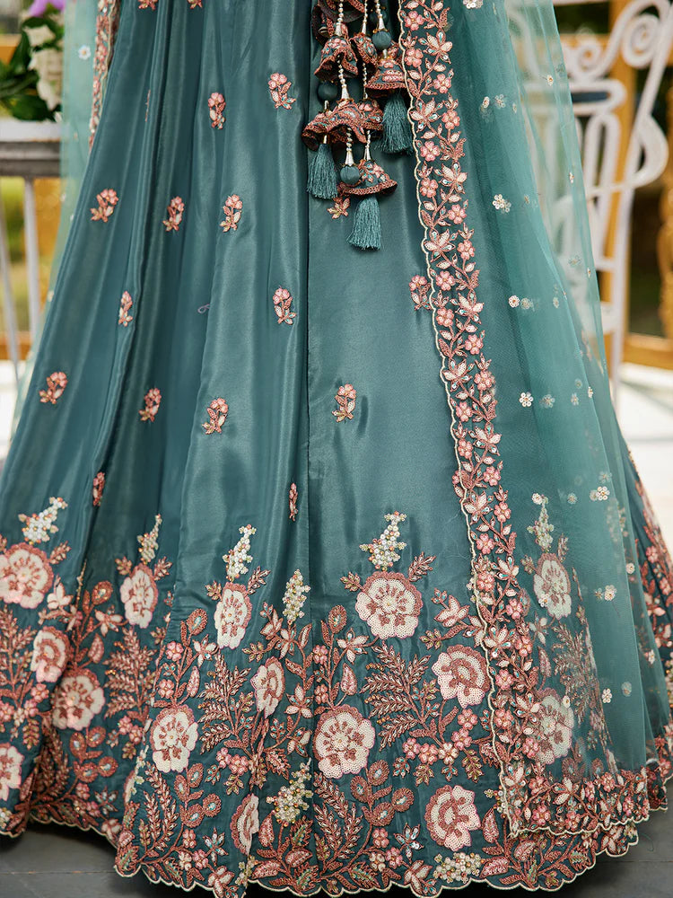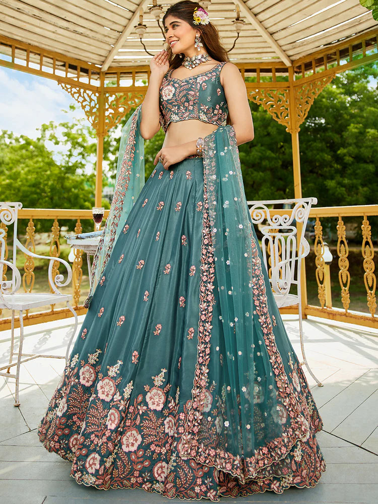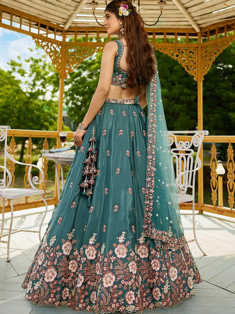 Teal Satin Lehenga Choli Set with Net Dupatta Heavy Embroidered indian Outfit