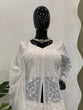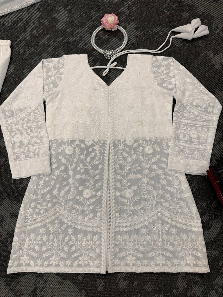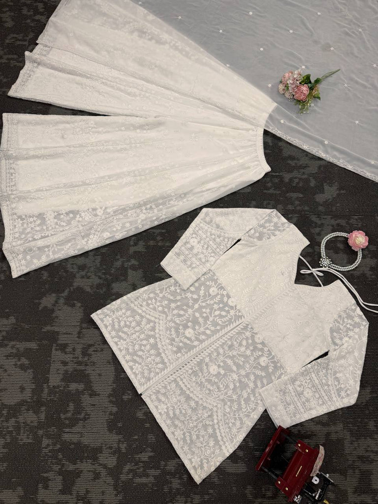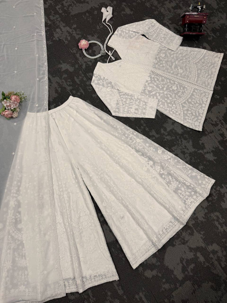 White Elegant Faux Georgette Thread Work Top-Plazo-Dupatta Set for Women