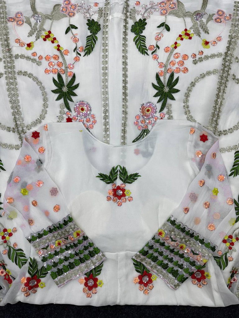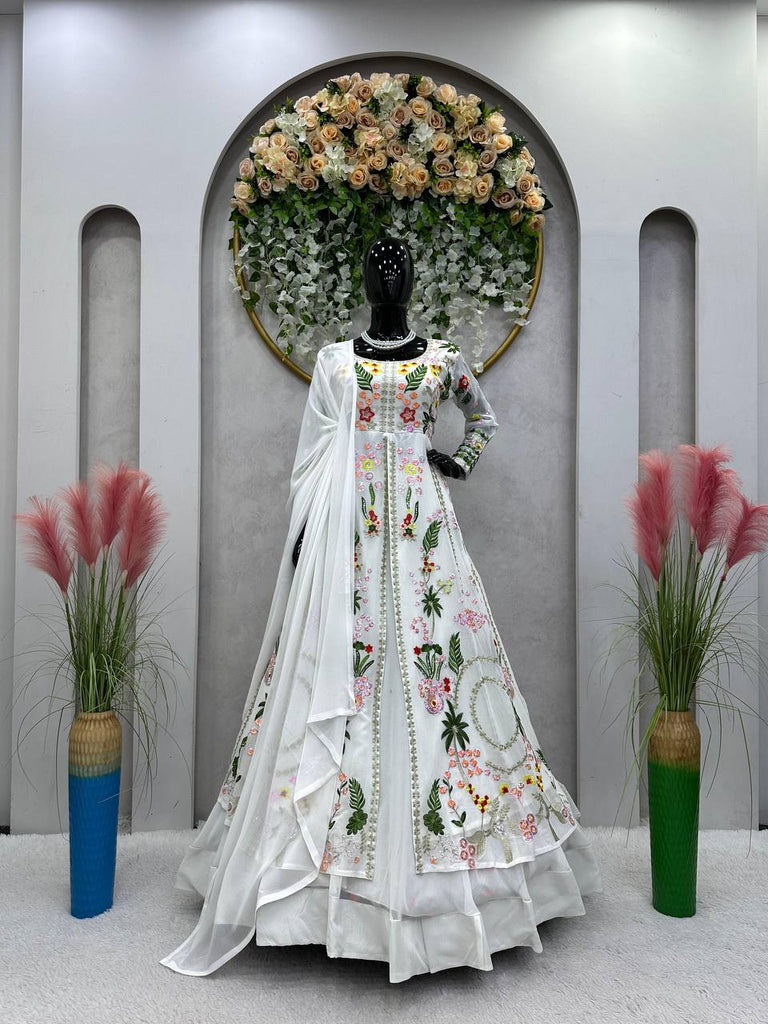 White Elegant Fox Georgette Lehenga Set with Full-Stitched Top & Lace Border Dupatta