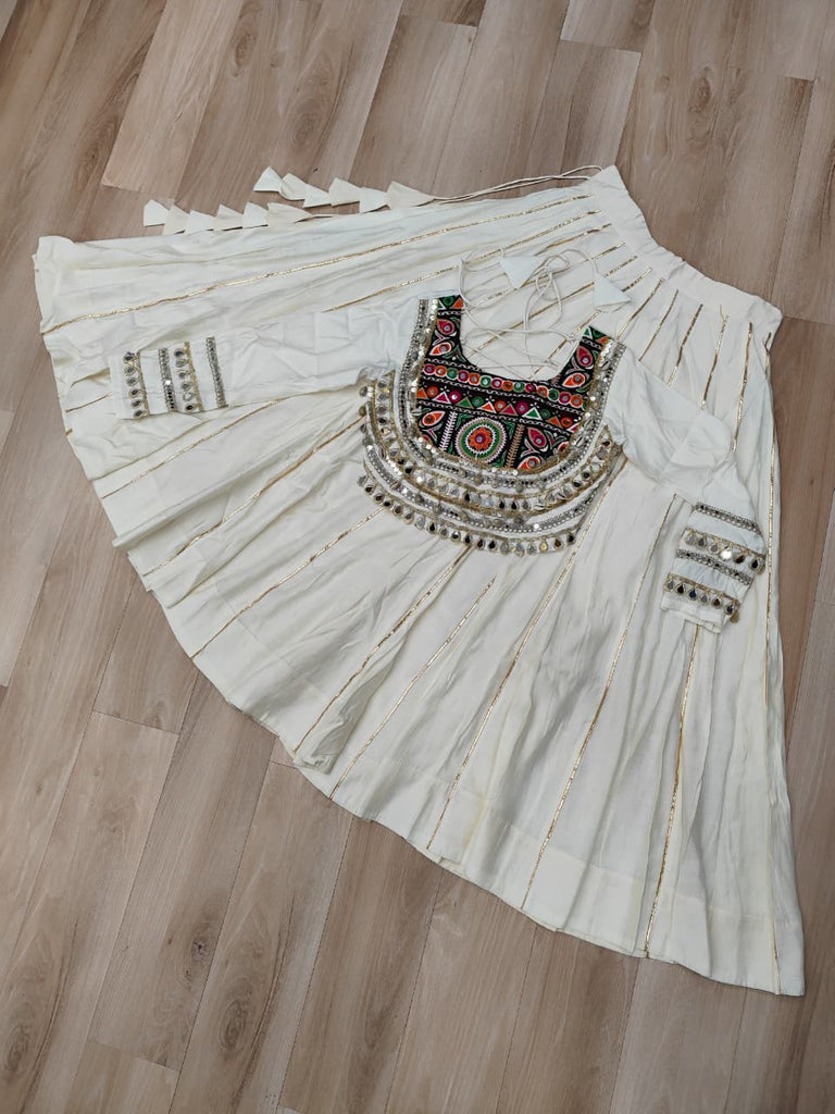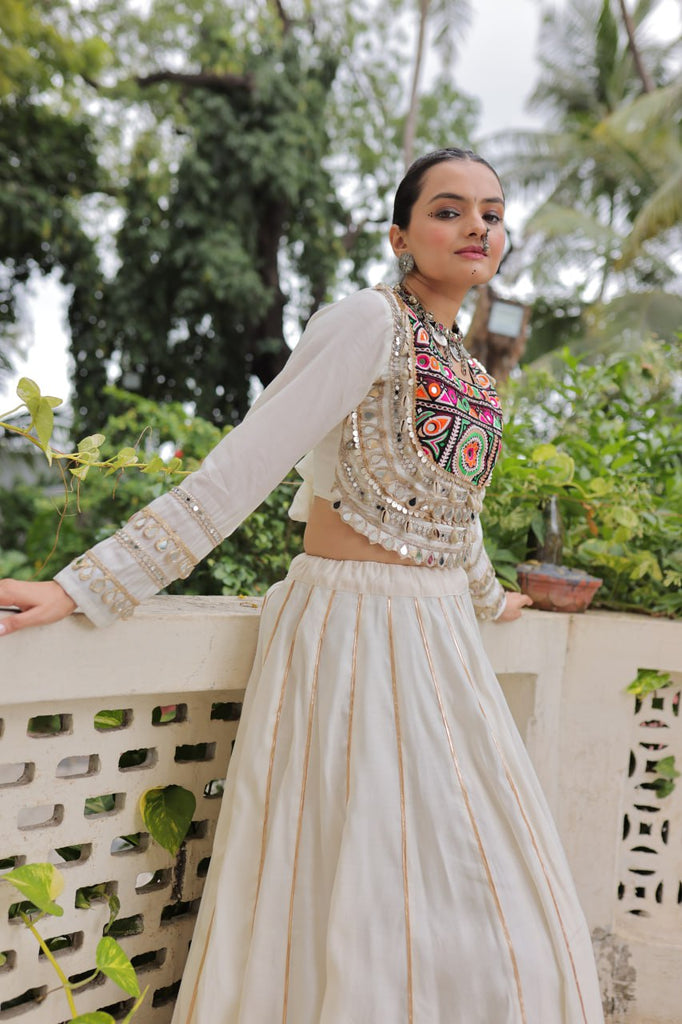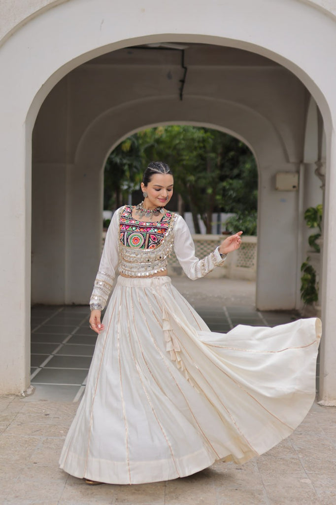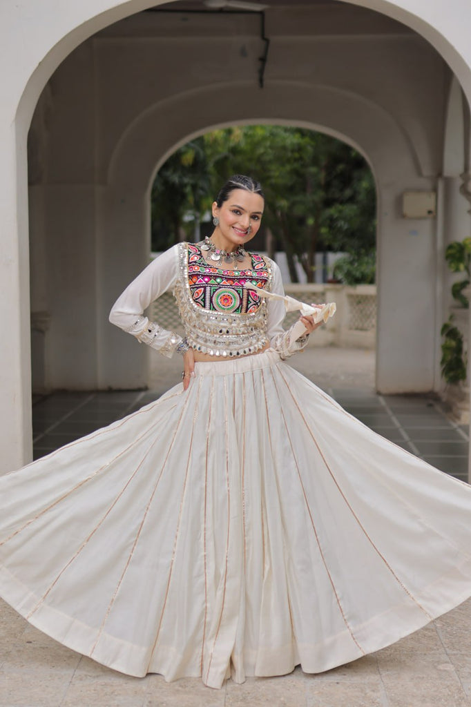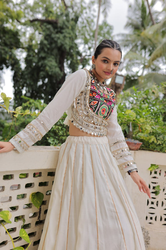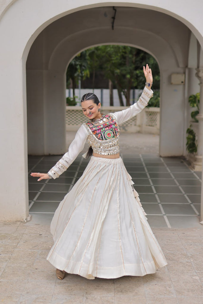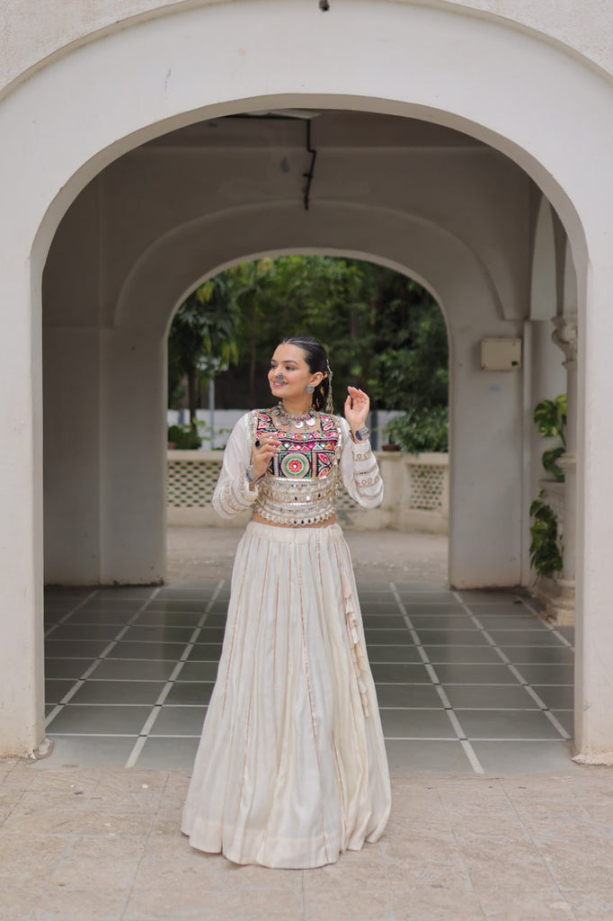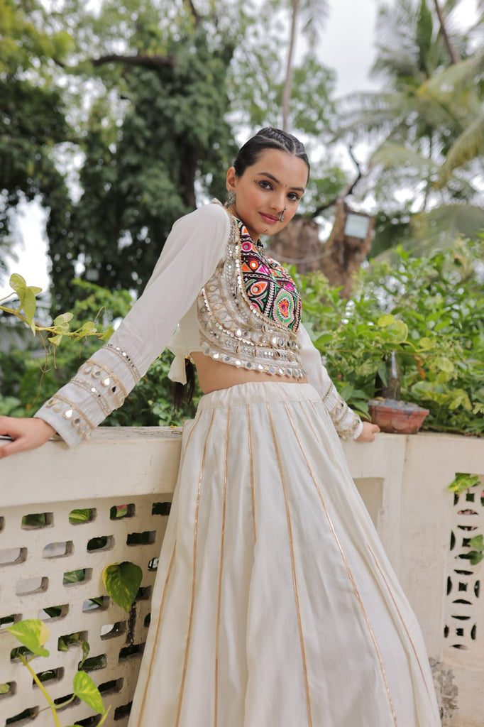 White Navratri Special Roman Fabric Lehenga Choli with Kutchi Gamthi & Mirror Work