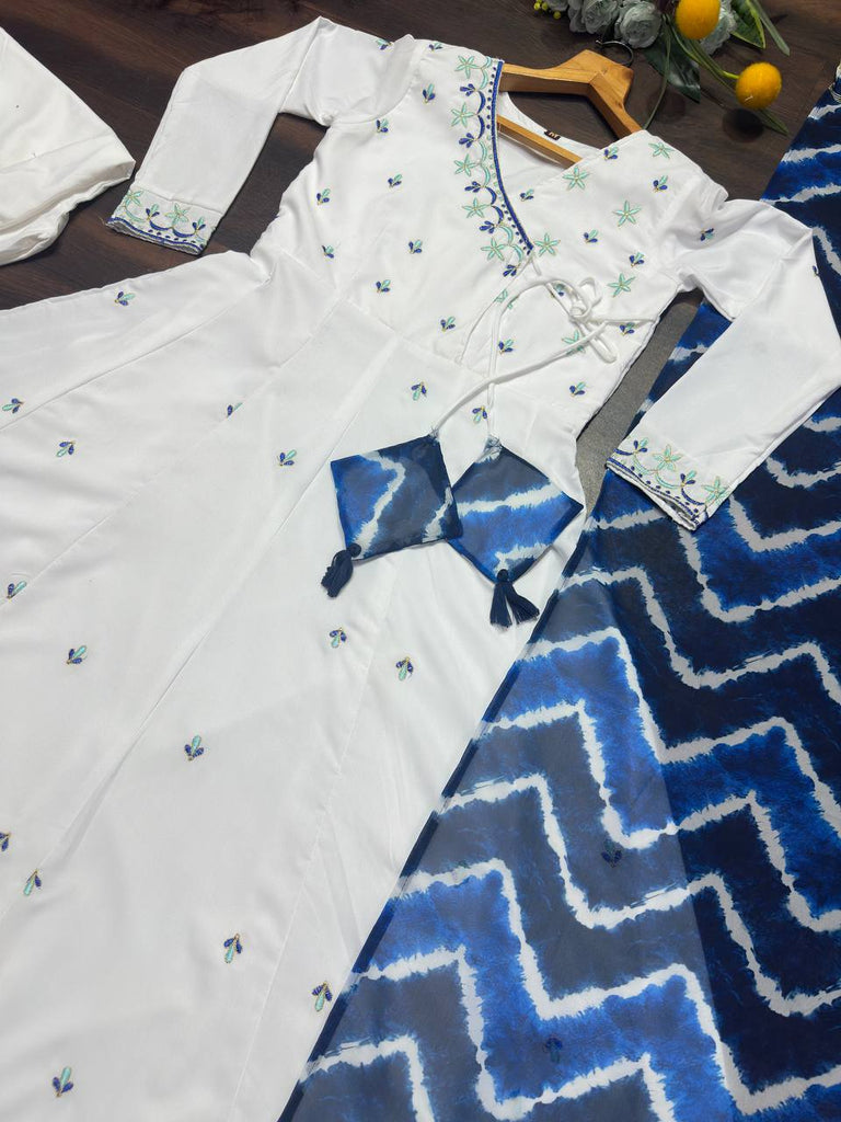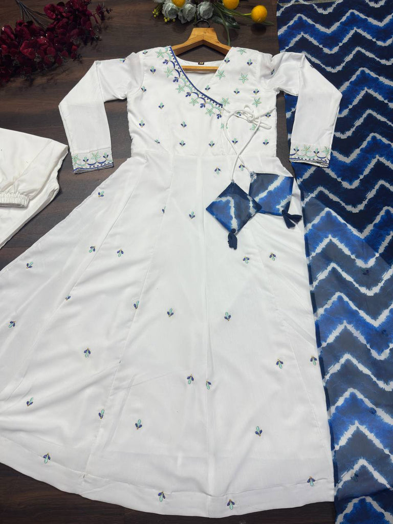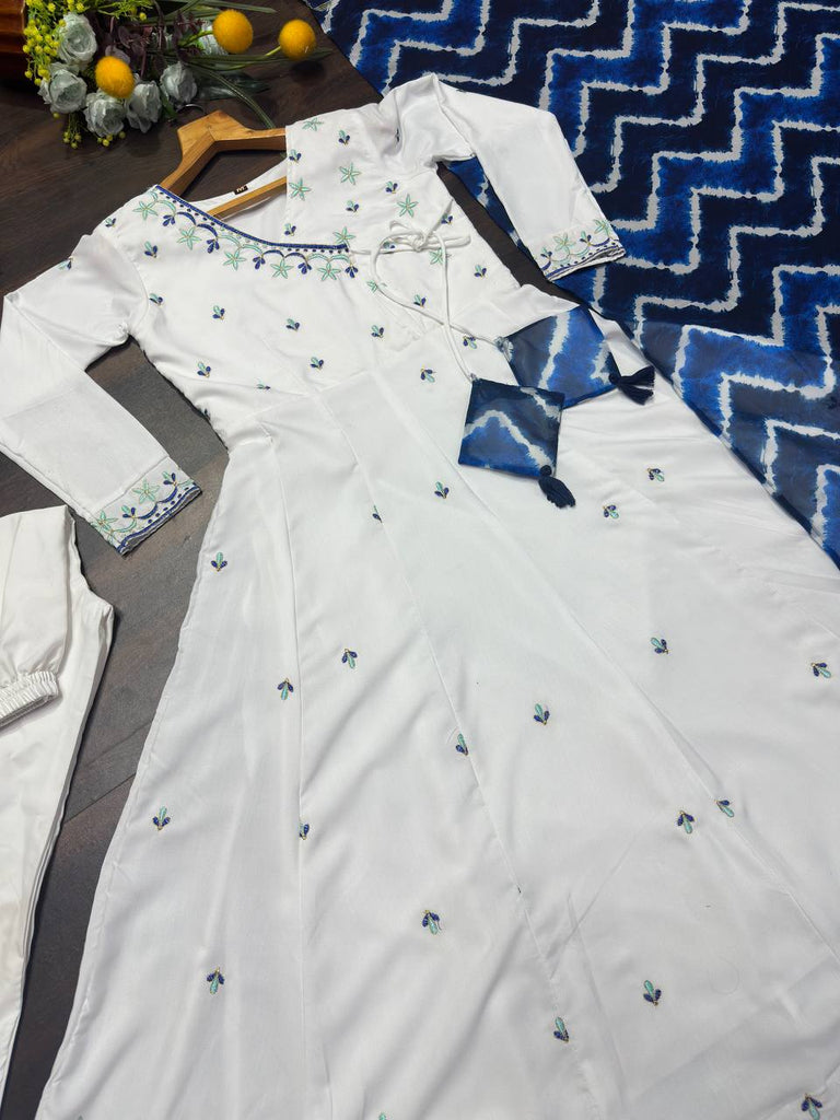 White Premium Rayon Zari Embroidered Anarkali Suit Set with Digital Printed Dupatta & Pants