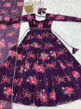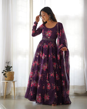 elegant Wine floral printed organza long suit, designed for the upcoming wedding season and celebrations. This luxurious and fully stitched Pure Soft Organza Silk Anarkali Gown Set comes complete with intricate details and a sophisticated look.