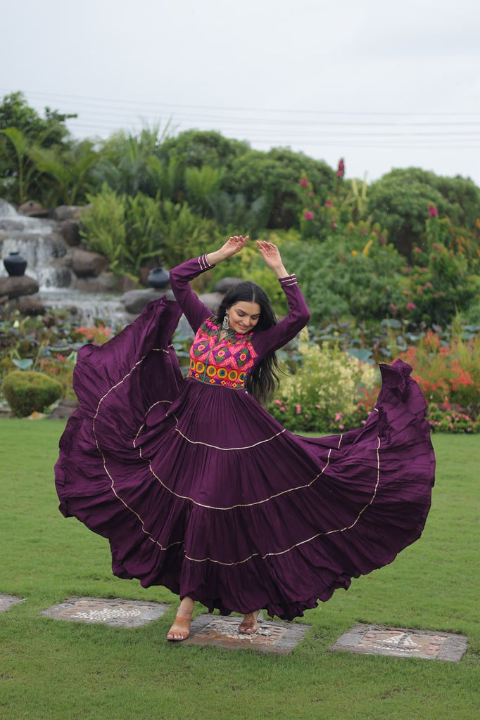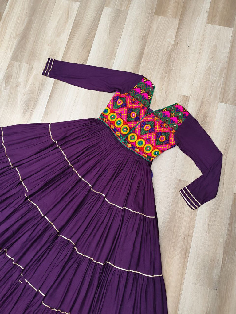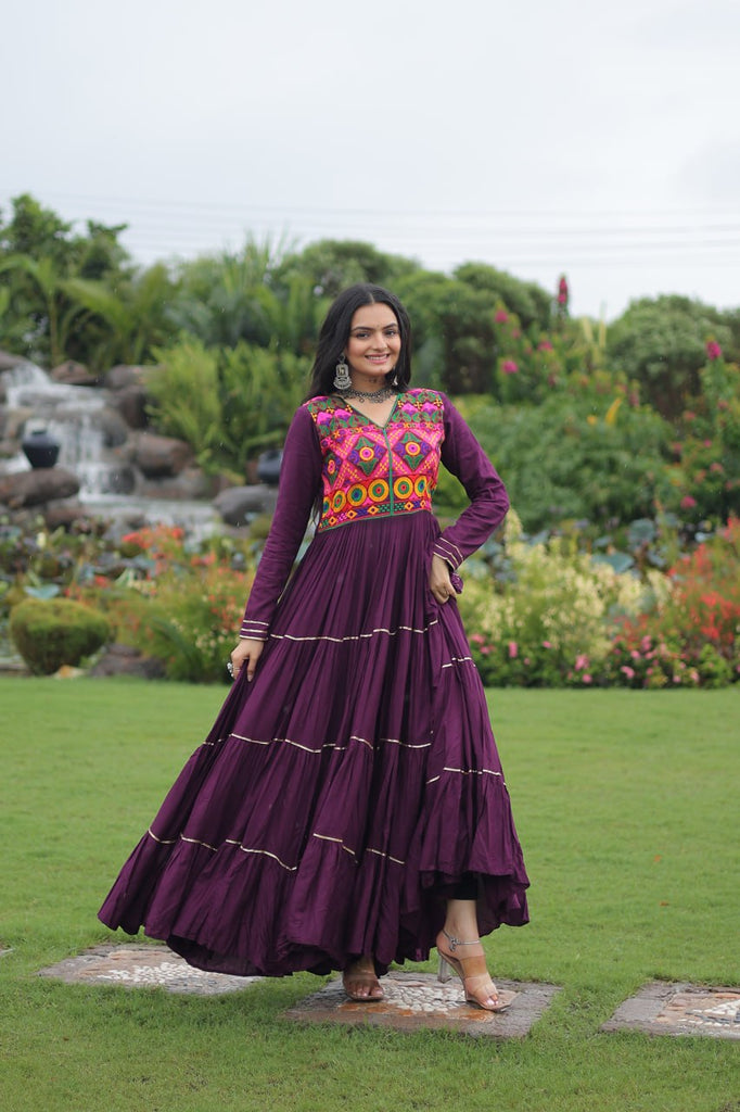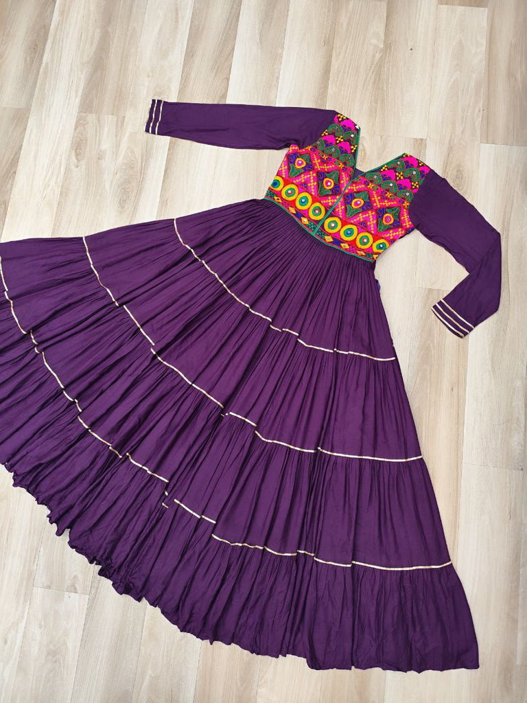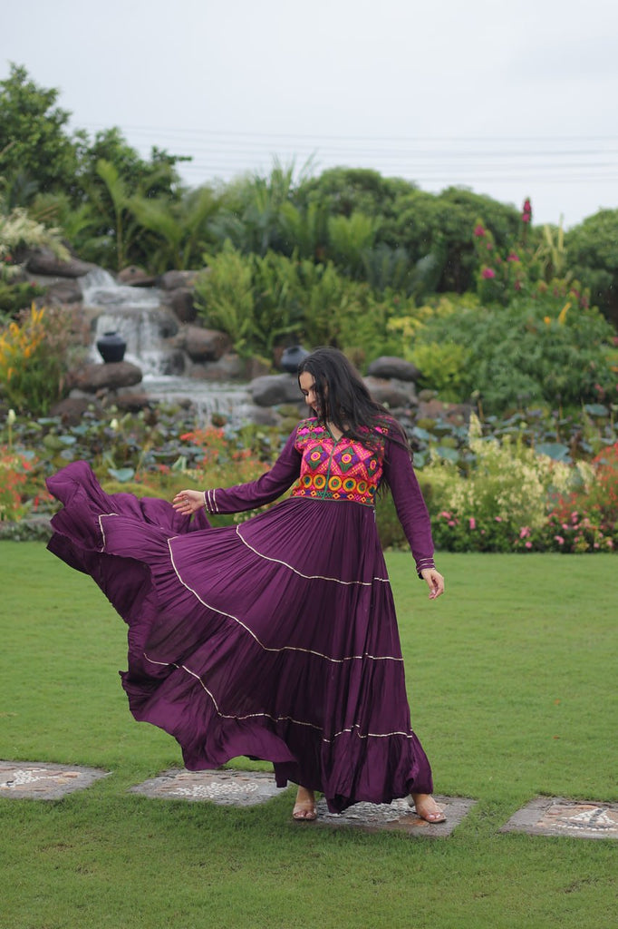 Wine Navratri Special 14 Kg Reyon Gown with Kutchi Gamthi & Mirror Hand Work – 4-Layer Frill, 10+ Meter Flair
