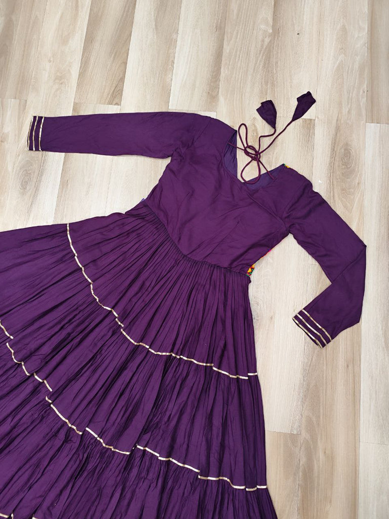Featuring a dramatic 4-layer frill stitch enhanced with Gota Patti lace, a bold 10+ meter flair, and a stylish fancy V-neck (front & back), it’s ideal for Garba, Dandiya, or any cultural celebration. The full-length cotton lining and full sleeves offer comfort with style, while its adjustable stitched design ensures a flattering fit.
