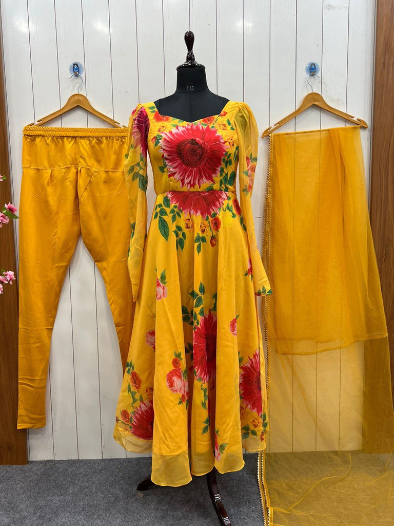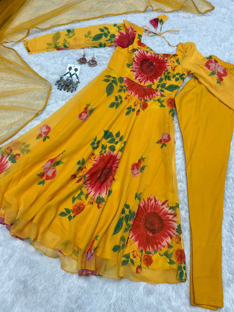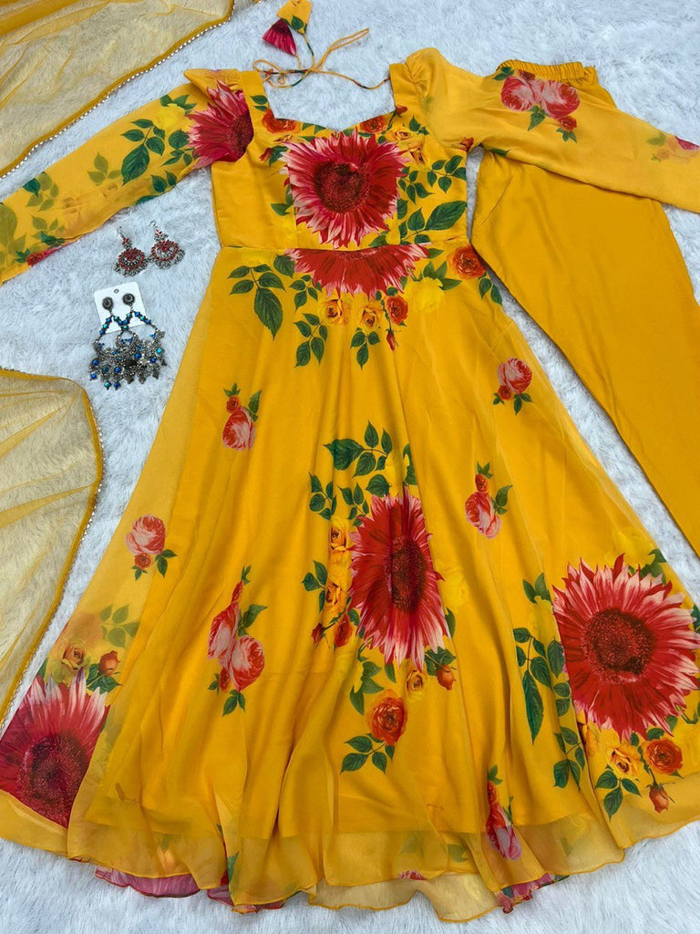 Yellow Elegant Pure Soft Fox Georgette Floral Churidar Gown Set with Dupatta – Ready to Wear