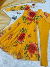 New Pure Soft Fox Georgette Floral Print Gown Set, designed for effortless grace and comfort. This fully stitched, ready-to-wear ensemble features a beautifully flowing full-flair gown with intricate churidar sleeves and matching churidar pants for a sophisticated look.