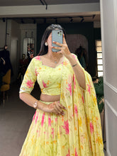 Yellow Silken Blooms Tabby Silk Floral Print Lehenga with Lace Accents & Matching Dupatta